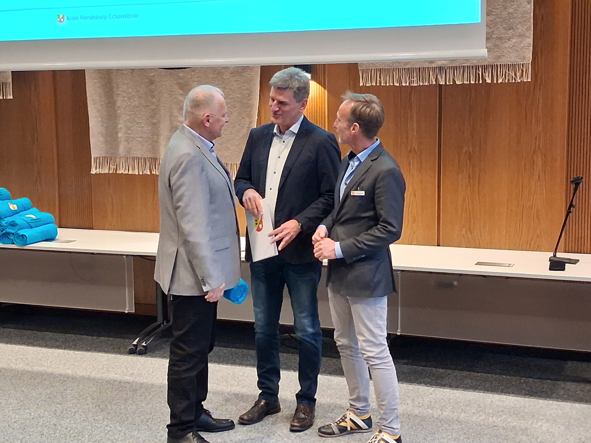 Aus den Händen von Ekkehard Krull (Vorsitzender Kreissportverband Rendsburg-Eckernförde) und Dr. Michael Schunk (Stellvertreter der Kreispräsidentin) erhielten fünf Mannschaften des TSV Kronshagen Urkunden und Badetücher als Auszeichnungen für hervorragende Leistungen im Jahr 2025. Zu den nominierten zählten einmal die U 12 Basketball-Mannschaft, die Fußball-Junioren Mannschaften C (Regionalliga Meister und Kreispokalsieger) und A (Oberliga-Meister und Kreispokalsieger), sowie die Handball männliche C-Jugend (Regionalliga-Meister, 5. Platz DM) und das Beach-Handball-Team B-Jugend (Landesmeister, 5. Platz DM U16). Ferner wurde auch Pressewart Heiko Drescher für das Ehrenamt geehrt.